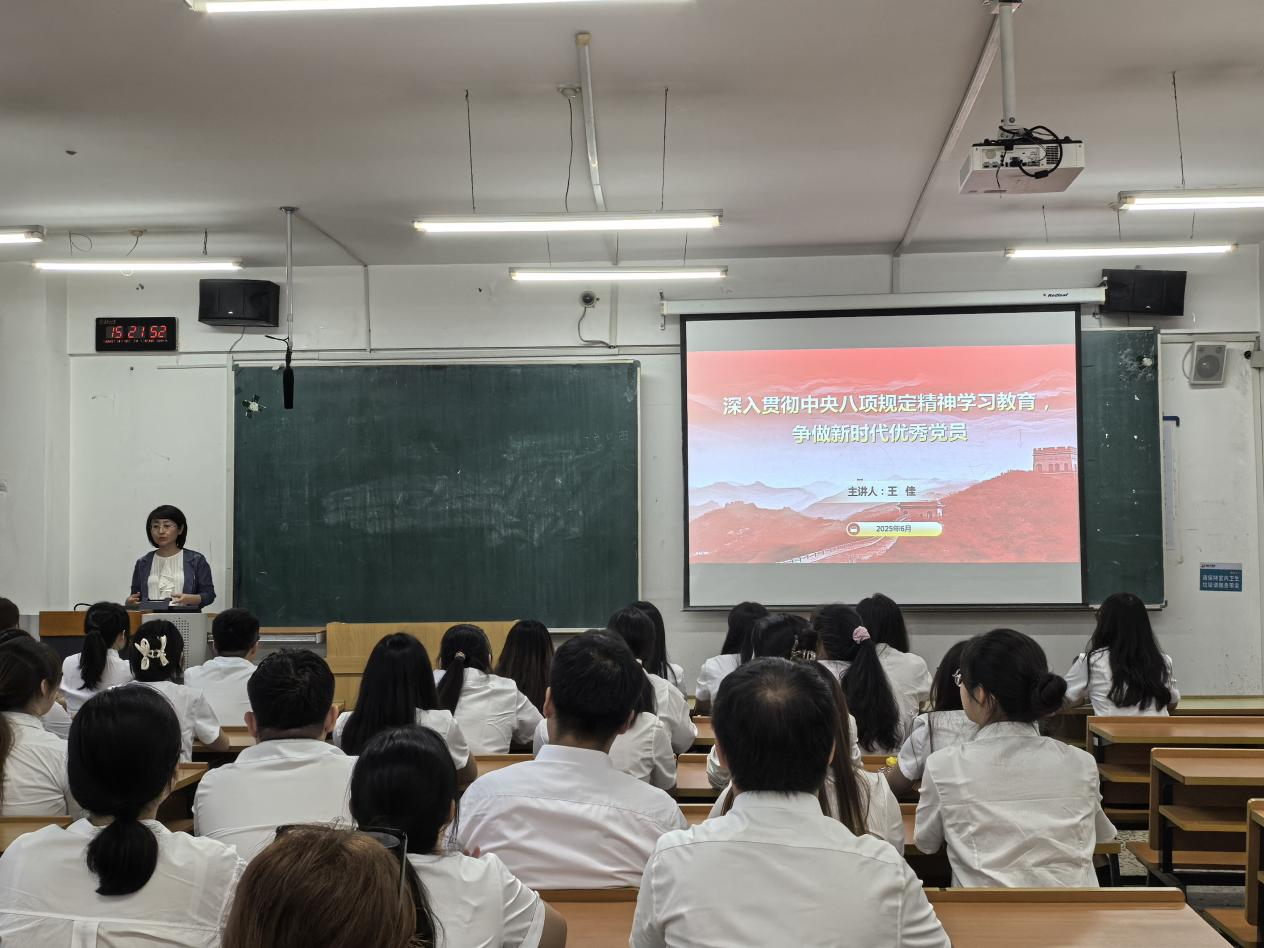 王佳从三个方面进行中央八项规定精神内涵的讲解:一要深刻领会党中央部署学习教育的政治考量,坚定作风建设永远在路上的信念。员工党员要深入学习领会中央八项规定及其实施细则中的内容,认真对照检视自身存在的差距和不足,切实增强纪律意识和规矩意识。她强调作为员工党员,密切联系群众是同学们必须深刻理解并付诸实践的要点,在日常学习生活中要发挥表率作用,密切联系班级同学,了解班情民意,解决大家的实际需求。二要准确把握中央八项规定精神的核心要义,树牢价值追求。全体党员要时刻检视自身言行,增强内在自觉,将纪律要求内化为价值追求和行为习惯;自觉抵制各种歪风邪气,做到知敬畏、存戒惧、守底线。三要自觉践行新时代青年的使命担当,争做忠诚、干净、担当的模范践行者。王佳结合老员工的学习、生活和未来工作实际,要求青年党员防微杜渐,从身边的小事做起,时刻紧绷纪律之弦,筑牢信仰之基;在学术科研中,要弘扬求真务实、严谨细致的学风,力戒浮躁,将优良作风转化为刻苦学习、服务同学、奉献社会的实际行动,展现新时代青年党员的良好风貌。