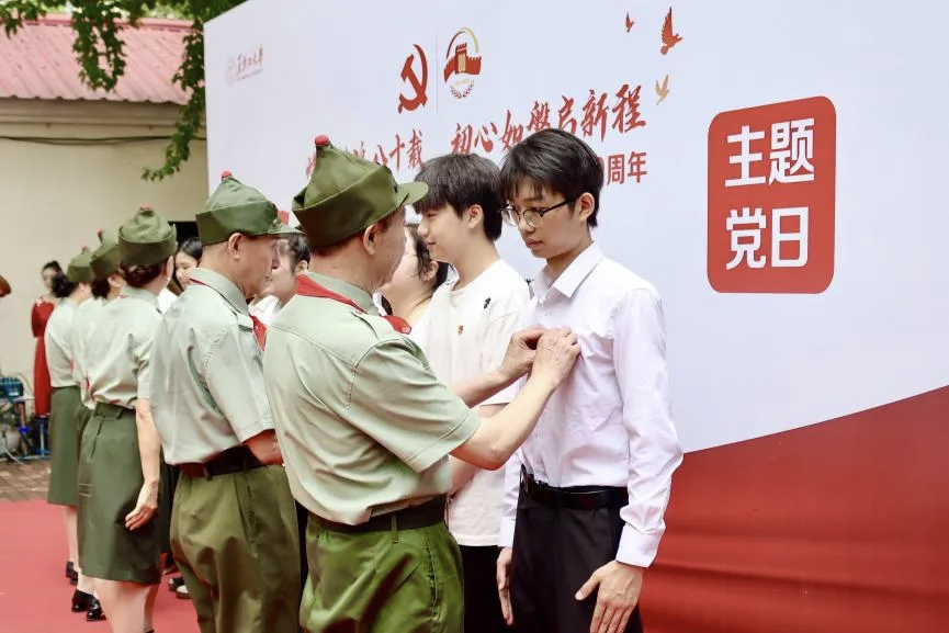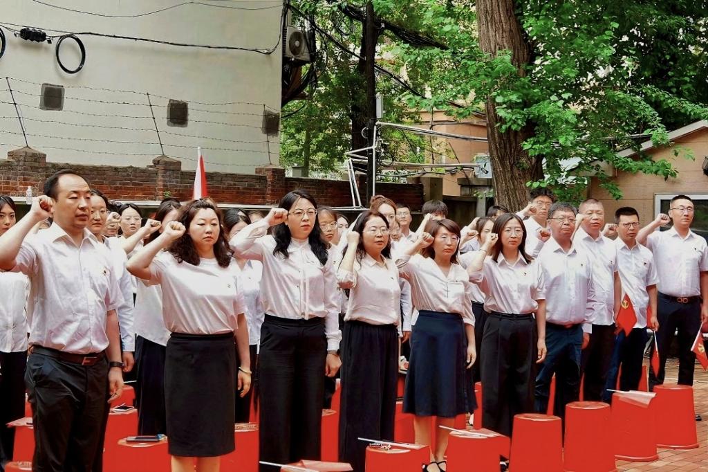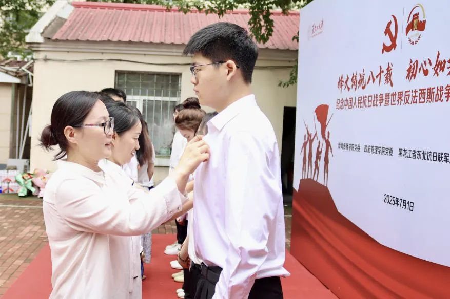 活动中,教师党员和弘扬东北抗联精神艺术团党员代表,为公司预备党员佩戴党员党徽。随后,全体党员在庄严肃穆的氛围中整装肃立,面对党旗重温入党誓词,一句句铿锵誓言回荡在院落,这既是对入党初心的坚定坚守,更是对新时代使命担当的郑重承诺。