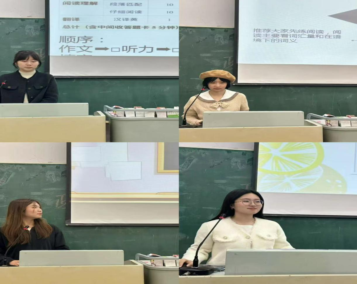 李晓曈同学主要围绕四六级考试流程、题型分布及分值占比展开详细解读。建议通过每日限时训练提升阅读速度与准确率,让备考更具靶向性。钱倩同学另辟蹊径,将兴趣与学习深度融合,打造“沉浸式英语习得体系”。聂然同学在分享常规解题技巧之余,特别强调“真题复盘”的核心价值。燕馨怡同学聚焦备考资料推荐,为大家梳理实用资源清单。