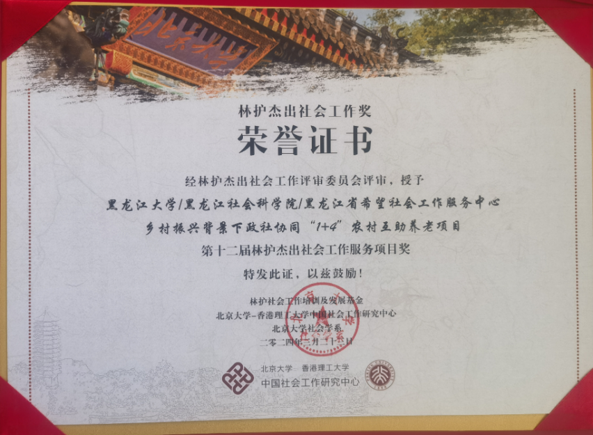 由公司xcsports社会工作专业团队与黑龙江省社会科公司、黑龙江省希望社会工作服务中心联合申报的《乡村振兴背景下政社协同“1+4”农村互助养老项目》荣获第十二届林护“杰出社会工作服务项目奖”。