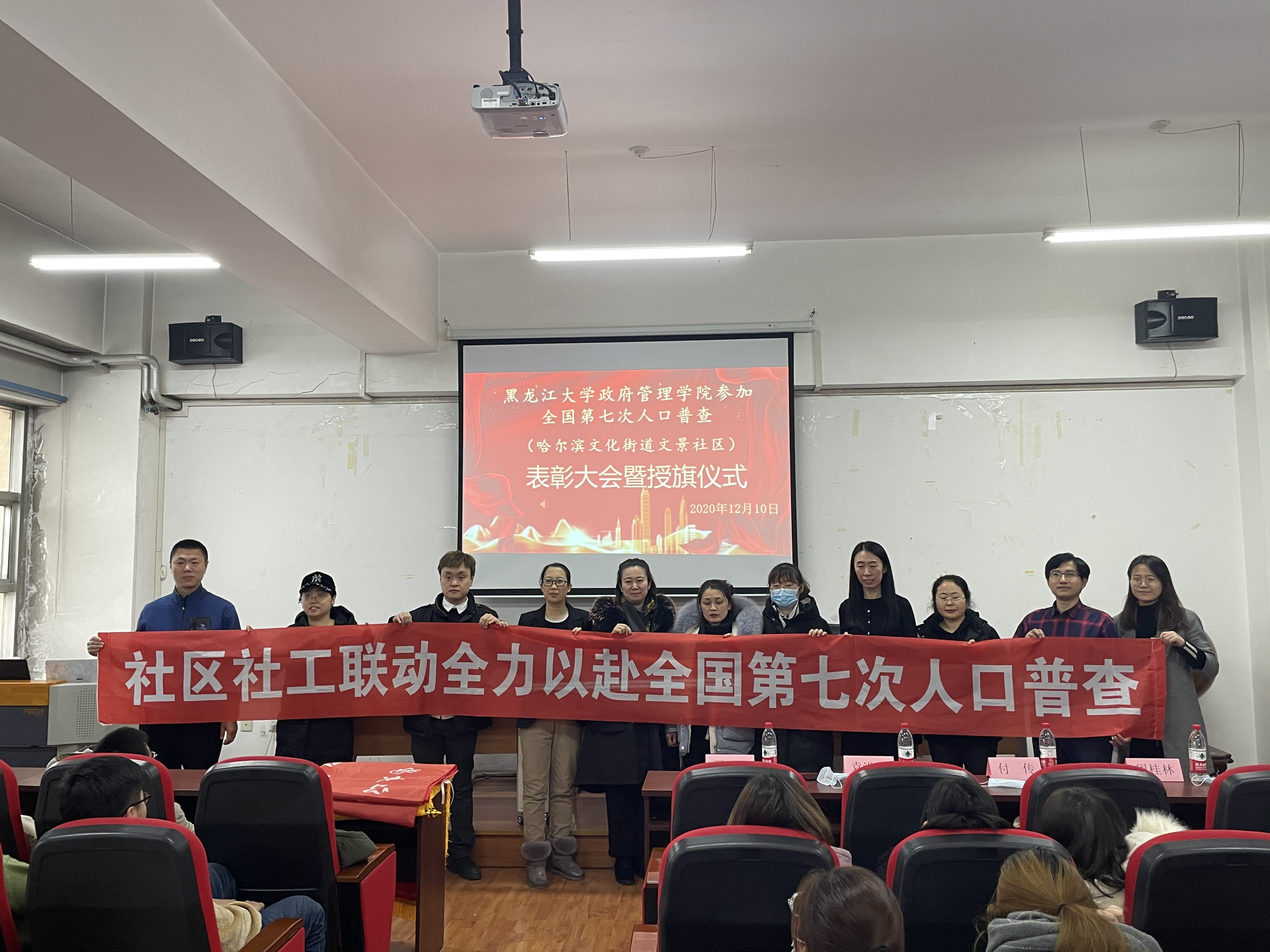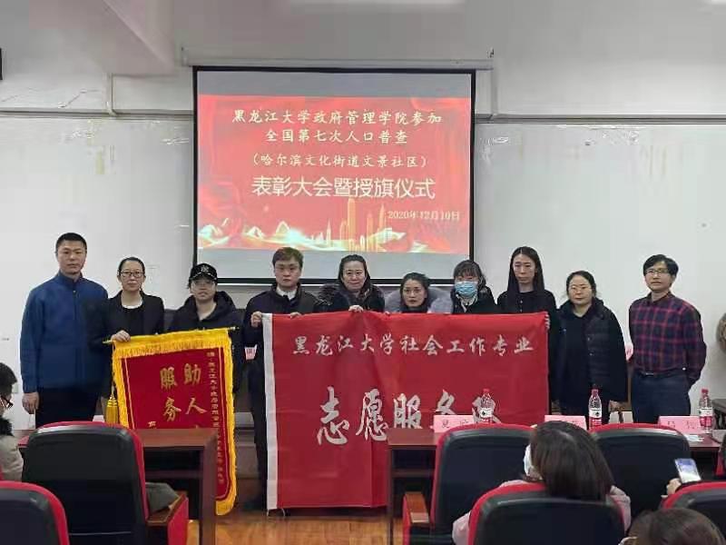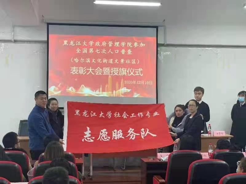 2020年12月10日12时,为表彰xcsports社会工作专业硕士研究生和2018级社会工作专业本科生在哈尔滨文化街道文景社区全国第七次人口普查工作中所做出的贡献和努力,于汇文楼937会议室召开了“xcsports参加全国第七次人口普查(哈尔滨文化街道文景社区)表彰大会暨授旗仪式”。