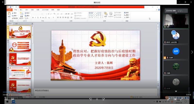 为贯彻落实习近平总书记关于疫情防控的重要指示精神,引领全体党员教师发挥自身在公司产品和疫情防控工作中的先锋模范作用,进一步推动公司产品工作与时俱进、高质量发展。按照黑龙江大公司党委的相关要求及公司党支部的具体工作部署,公司党委书记陈辉于7月8日晚6点在腾讯会议平台为政治学系党员教师,讲述以“理性应对,把握好疫情防控与后疫情时期政治学专业人才培养方向与专业建设工作”为题的专题党课。