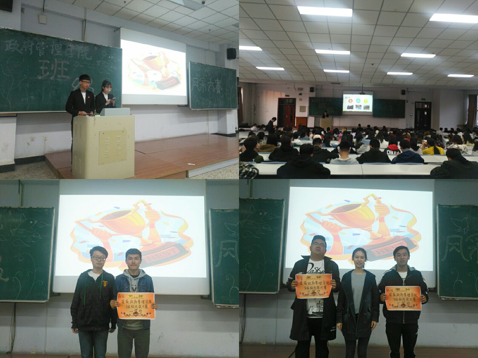 活动伊始,每个班级依次按照抽签决定的顺序上台表演。此次风采大赛共分为“班级介绍”、 “展现班级风采”和“加分游戏”三个环节。在第一环节中,各班代表上台进行ppt或视频等形式的展示,着重展现了班级积极向上的一面,体现新一代老员工特色以及班级集体的优良学风和健康的生活习惯。第二环节的班歌展示,每个班级由讲解员向评委老师和同学们讲解选择这个班歌的缘由,并进行集体演唱,行政管理班级的《明天你好》、社会学班级的《让我留在你身边》、社会工作班级的《倔强》、政治学与行政学班级的《平凡之路》、土地资源管理班级的《奔跑》,这些班歌的演唱使现场的氛围迅速升温,欢笑背后,意义深刻。每一位班级干部都清楚自己肩膀担负的责任,每一位班级成员也都拥有集体荣誉感。第三环节的加分游戏更是调动了整场的气氛,掌声不断。所有环节结束,经评委打分,社会学专业班级赢得一等奖,社会工作专业与土地资源管理专业班级获得二等奖,行政管理专业和政治学与行政学专业班级获得三等奖。在一阵热烈的掌声后,本次比赛圆满落幕。