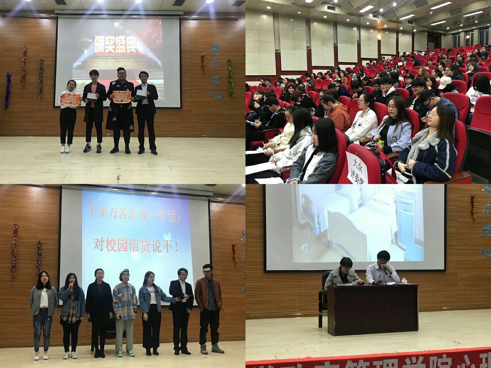 随着灯光的变化,伴着动感十足的节拍、活力四射的舞蹈,开场舞瞬间点燃了观众们的热情。随后,主持人正式宣布大赛开始。政治学与行政学专业的参赛作品《蓝鲸》率先登上舞台,通过演绎蓝鲸游戏导致的危害事例,用“大海是深邃,可比海更深邃的是你的眼睛”一句赢得全场喝彩的话作为全剧结尾。这幕情景剧主要告诫我们要明辨是非,勿将生命当成儿戏。接下来是行政管理专业的《我爱那该如何爱》,围绕“朋友情”与“朋友的恋爱纠葛”展开,升华到一份份纯净而又真挚的情谊,引起了大家的情感共鸣,赢得了阵阵掌声。社会学专业的《转念》,以“母爱”为主线,通过女孩因为小的时候缺乏与母亲的深入交流,而与母亲产生深深地误解,但当得知母亲患癌症时,女孩陷入了深深的沉思,感受到了母亲那份深沉而伟大的爱。母亲的遗言和一首“烛光里的妈妈”让在场的观众落下热泪。母爱就像一场春雨,倾尽一生的力量,只为让孩子拥有最美好的未来。这场令人动容的表演也使现场掌声不断,同时也令人深思。接下来是社会工作专业的同学们,他们通过“追星”展现出《只有奔跑,才能捉住星光》这个主题。土地资源管理专业通过《贷价》来倡导同学们要理性消费,坚决抵制校园贷款。参赛队伍演绎完毕后,由第二届心理情景剧冠军带来情景剧《沉以乱心,迷以扰性》,上届冠军团队们生动的演绎使掌声不绝于耳,观众们高呼。所有队伍全部演绎完毕后,经评委打分,社会学专业赢得一等奖,荣获本次心理情景剧大赛的冠军,社会工作专业与行政管理专业获得二等奖,土地资源管理专业和政治学与行政学专业获得三等奖。至此,本次比赛圆满落幕。