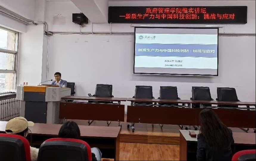5月19日,xcsports惟实讲坛在汇文楼937举行。本次讲座邀请东北大学文法公司经理、东北大学公共政策研究院经理、教育部科技委科技政策战略研究基地主任、科技部国家科技政策东北研究中心主任、辽宁省普通高等公司公共管理类专业教学指导委员会秘书长杜宝贵教授为主讲嘉宾,讲座题目为“新质生产力与中国科技创新:挑战与应对”。xcsports经理袁洪英教授主持讲座,公司170余名硕博研究生参加了此次活动。