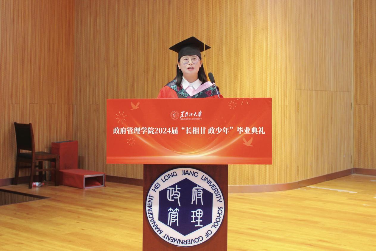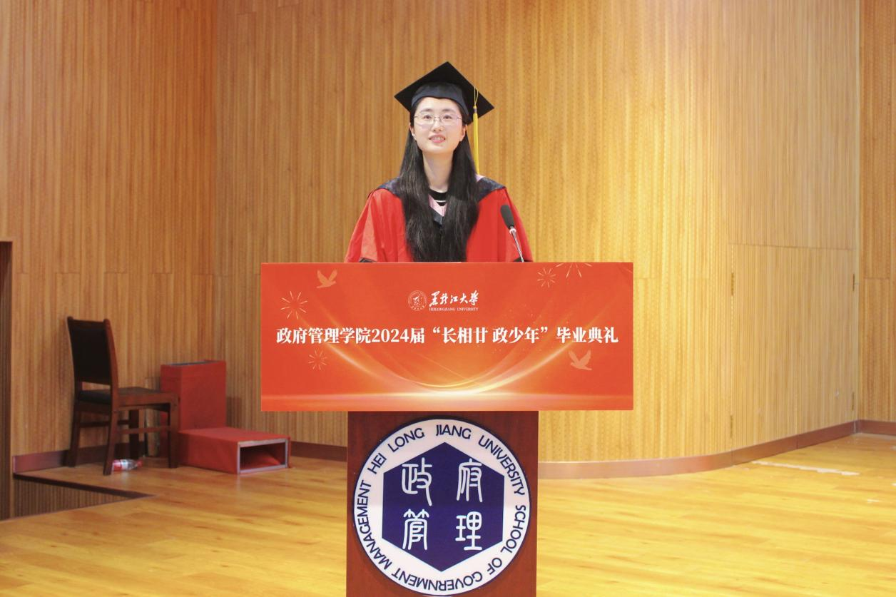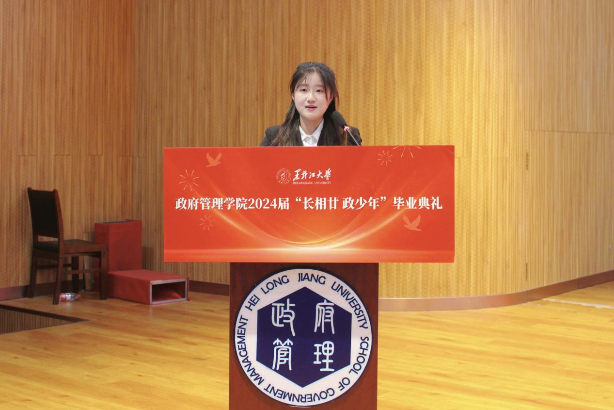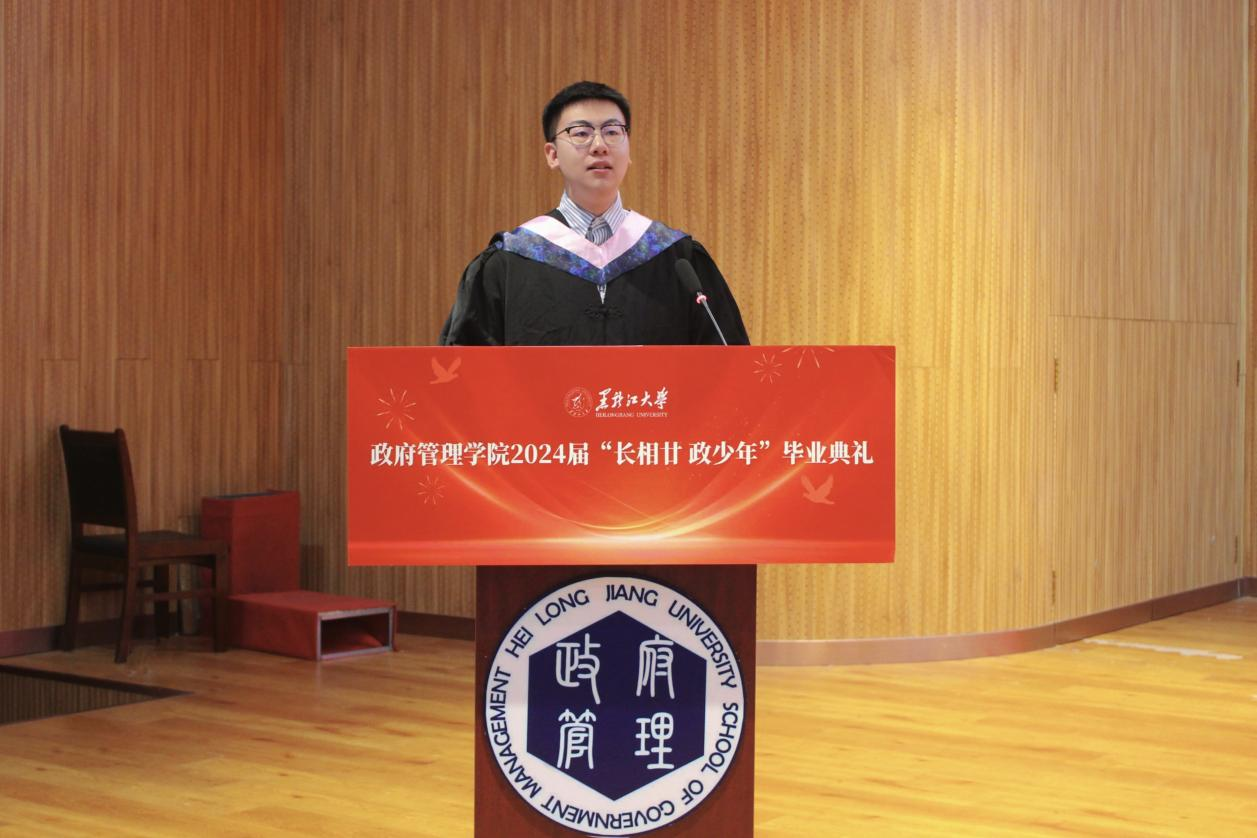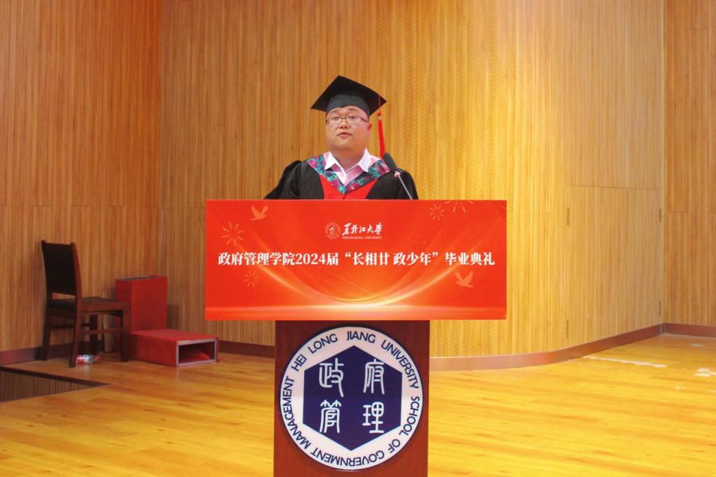典礼上,2020级政治学与行政学专业庄皓尧同学作为本科毕业生代表发言。他带着难离公司、难忘师恩、难舍同窗的眷恋,回望了大学四年的经历与成长,表达了对公司公司的崇高敬意与无限感激。研究生毕业生代表2020级公共管理专业博士生鹿海洋回忆了求知求学的点滴历程和成长蜕变,希望同学们能铭记作为黑大学子的责任担当,永远牢记黑大校训,继续弘扬黑大精神。2022级土地资源管理专业曲妍同学作为在校生代表发言。全体在校生将以学长学姐为榜样,用实际行动为母校的发展进步贡献青春力量。