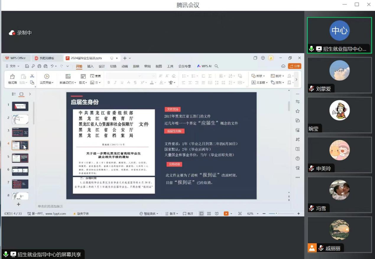 会议伊始,赵天明对毕业生进行就业政策全方位解读。近期公司多次开展选调生员工经验分享、基层就业项目答疑和线上一对一就业咨询,对国家和地方各类就业创业政策进行了讲解,希望大家能够积极关注就业政策,知晓、用好政策,鼓励同学们积极关注选调生、西部计划、三支一扶等基层就业项目。根据毕业生不同的就业去向,分为协议就业、升学、出国、灵活就业等。根据不同的员工类别,充分的进行了就业政策宣讲,鼓励同学们充分就业、尽快就业。