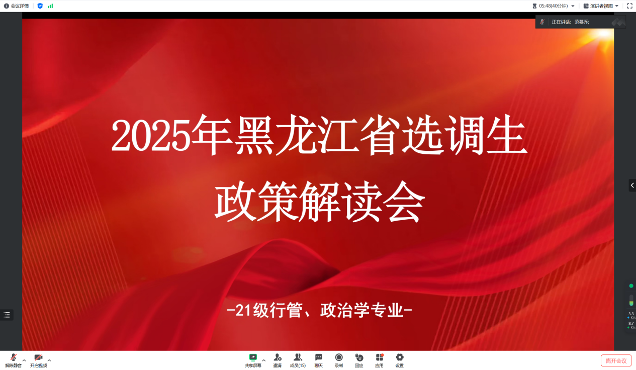 会议伊始,三位辅导员对黑龙江省选调生政策的背景和意义进行了介绍。他们指出,选调生是国家选拔优秀高校毕业生到基层工作的重要途径,旨在培养具有基层工作经验的高素质公务员队伍。对于同学们来说,这不仅是一次难得的就业机会,更是实现个人价值、服务国家和社会的重要途径。