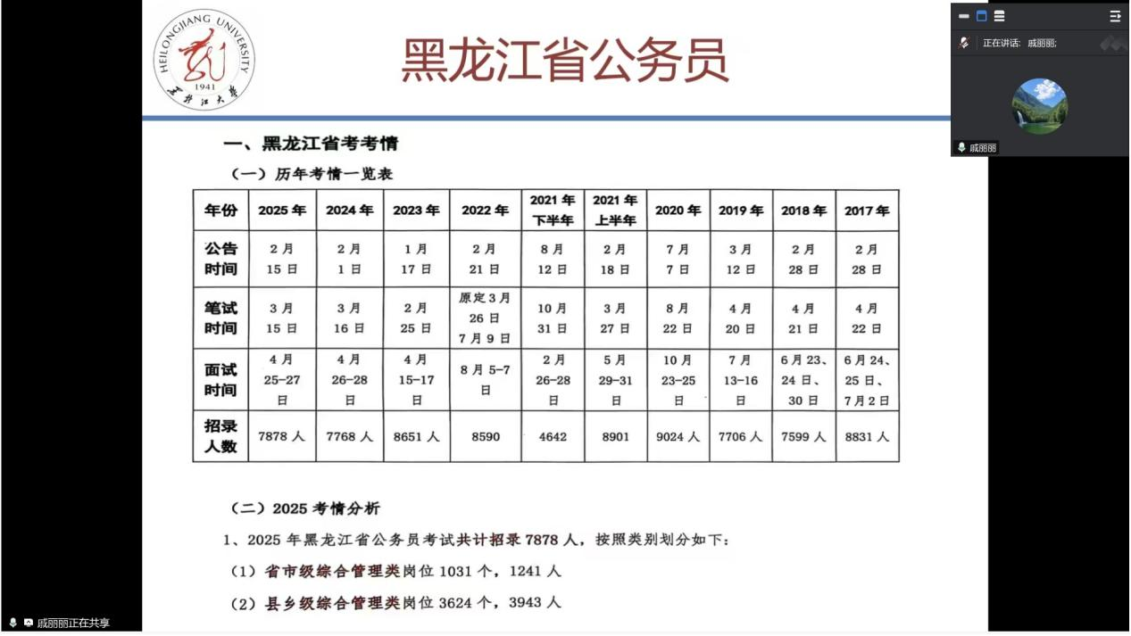 戚丽丽针对研究生最关注的公考这一类就业形式展开讲解。她介绍国考、省考、选调生、事业单位等公职类考试的报考政策与竞争态势,肯定了公职类岗位在职业稳定性与发展空间方面的优势与价值,但也要认清逐年递增的上岸难度。同时,她指出研究生就业路径具有多元性,鼓励员工突破思维定式,积极关注企业招聘渠道,拓宽就业机会。