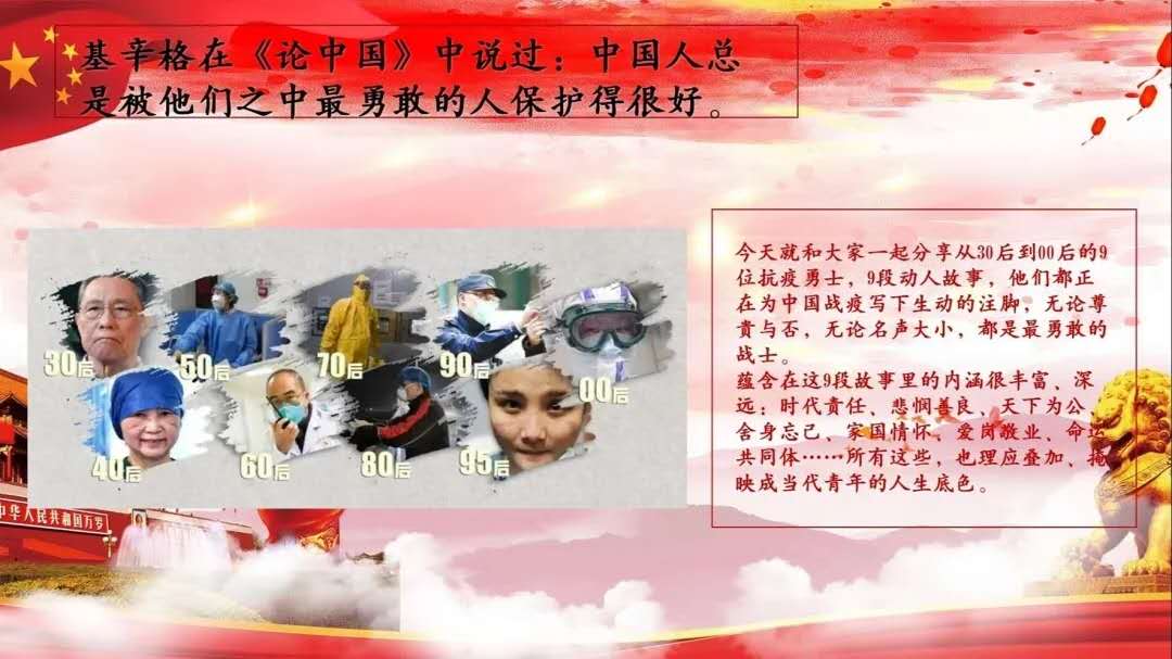 随后,刘老师带领同学们回忆了战争时期革命先辈们的英勇事迹,一同回首,发现太平盛世的来之不易,她与同学们分享了抗击疫情期间的英雄事迹,并号召同学们学习他们在危难时刻挺身而出的大无畏精神,将祖国发展与自身命运紧密联系在一起,不辜负先辈们的殷切期望,不断增强责任心与民族自豪感,培养家国情怀,继承革命先辈的光荣传统,时刻坚定“国是千万家,有国才有家”的理想信念。