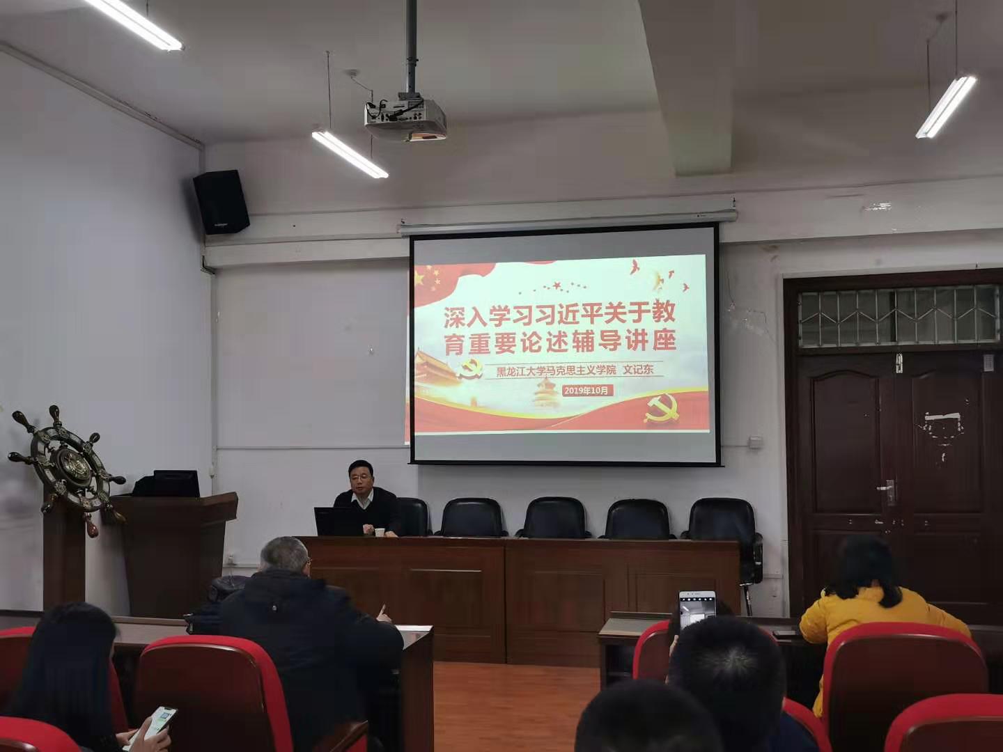 根据《关于开展“不忘初心、牢记使命”主题教育的工作方案》,xcsports紧紧围绕“不忘初心、牢记使命”的主题,牢牢抓住深入学习贯彻习近平新时代中国特色社会主义思想的根本任务。为锤炼教师党员忠诚干净担当的政治品格,特邀请马克思主义公司文记东老师于2019年11月13日下午在汇文楼942会议室开展了深入学习习近平关于教育重要论述辅导讲座。