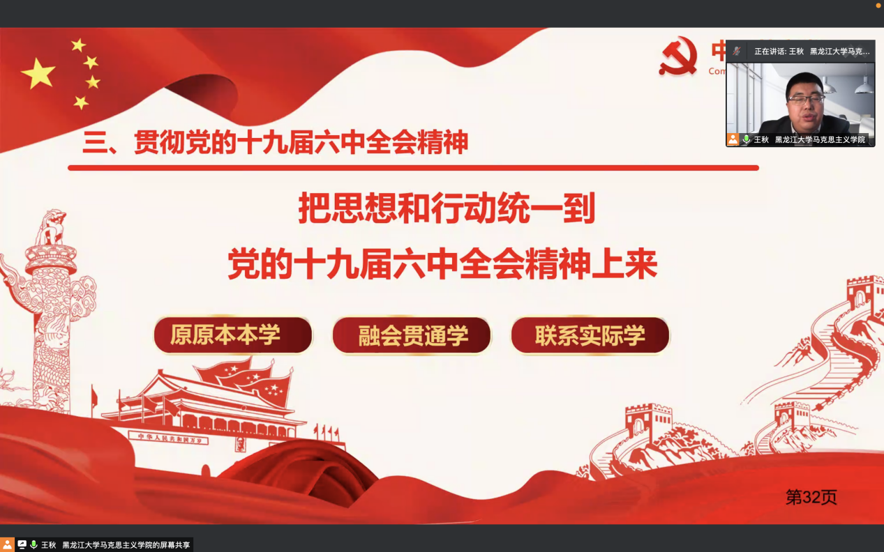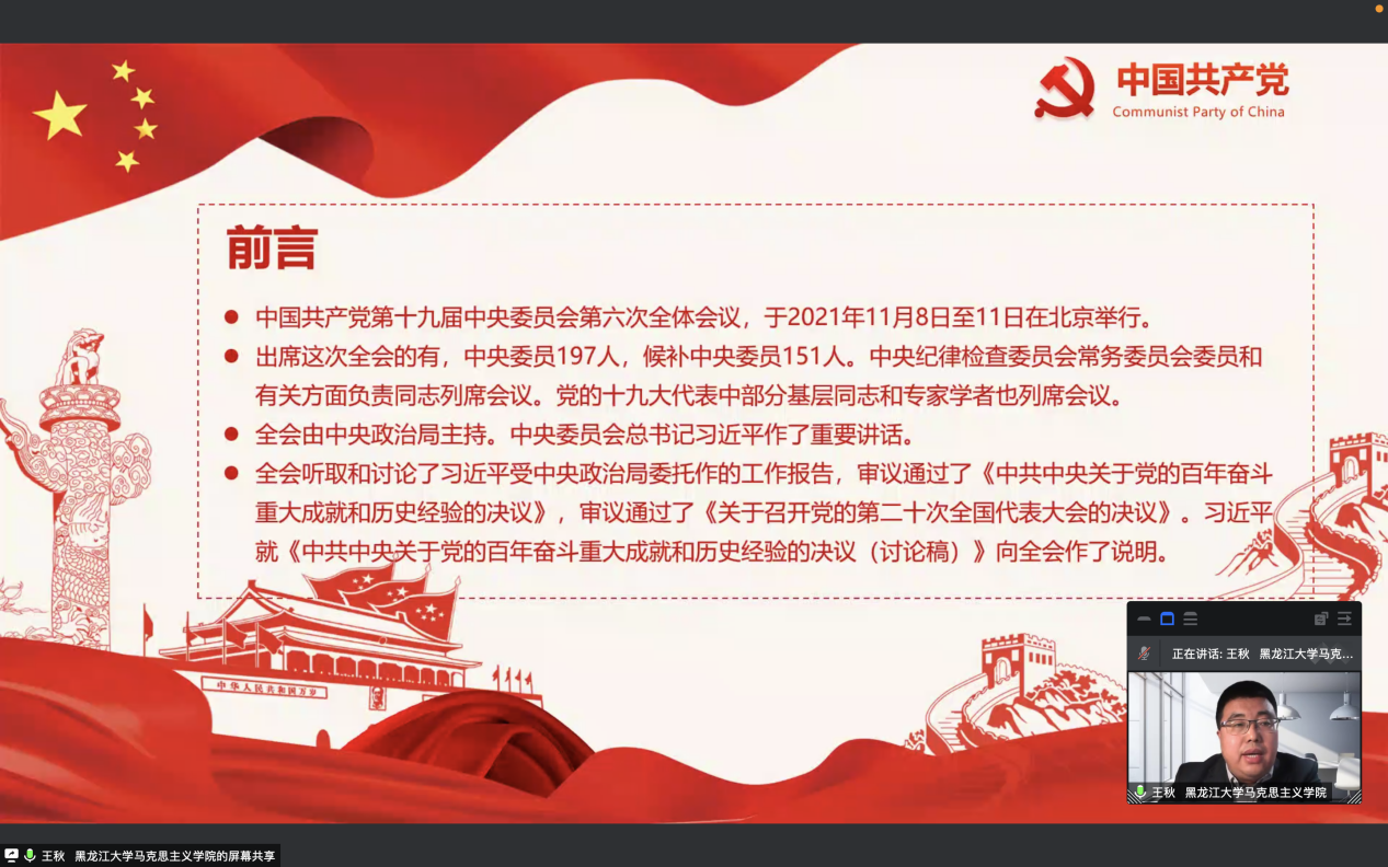 为深入贯彻落实公司党委《学习宣传贯彻党的十九届六中全会精神的通知》要求,强化理论学习,提升党性修养,力争在全院掀起学习热潮,xcsports、物理科学与技术公司于12月13日晚6时线上召开十九届六中全会精神宣讲会,本次会议邀请马克思主义公司副经理王秋进行宣讲,公司党委书记陈辉、物理科学与技术公司党总支书记孙普男主持会议,xcsports及物理科学与技术公司全体师生党员参加会议。