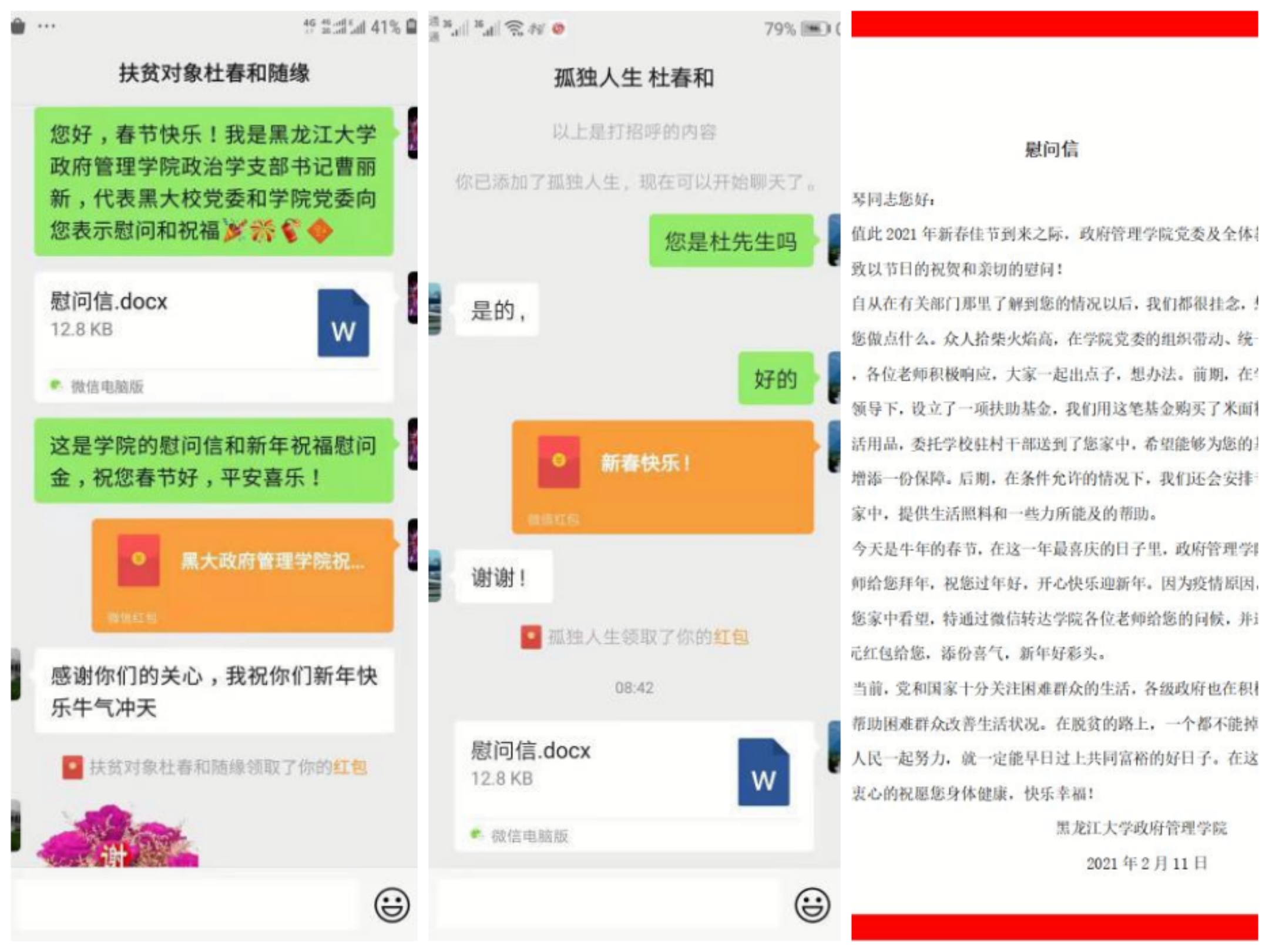 公司党委对此次网上拜年活动高度重视,牵头各教工党支部书记为贫困户撰写了新年慰问信,并启用公司扶贫专项基金委派各负责支部书记为贫困户送上新年慰问红包。值此新春佳节,公司社会学系党支部书记曹颖、公管系党支部书记段绪柱、政治学系党支部书记曹丽新分别采用电话、微信视频等方式,代表xcsports全体教师为结对帮扶的高凤琴老人、杜春和先生送上了新春慰问和祝福红包,衷心祝愿其新年愉快、健康长寿、生活幸福。并表示,后期,在条件允许的情况下,公司党委还会安排专人到访家中,提供生活照料和一些力所能及的帮助。