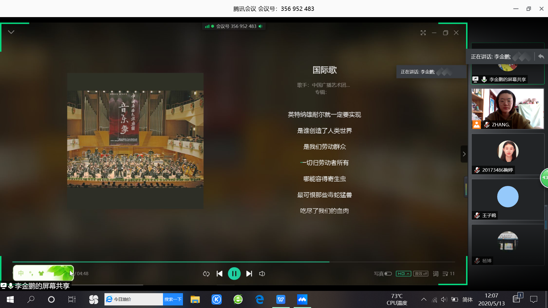 为了使入党发展对象更加深刻的感受、了解共产主义精神,进一步激发入党发展对象的爱党、爱国热情,xcsports于5月13日中午在腾讯会议举办了线上“学唱国际歌”活动。本次活动由公司团委副书记刘千瑞老师主持,第五十九期入党发展对象全员参加。