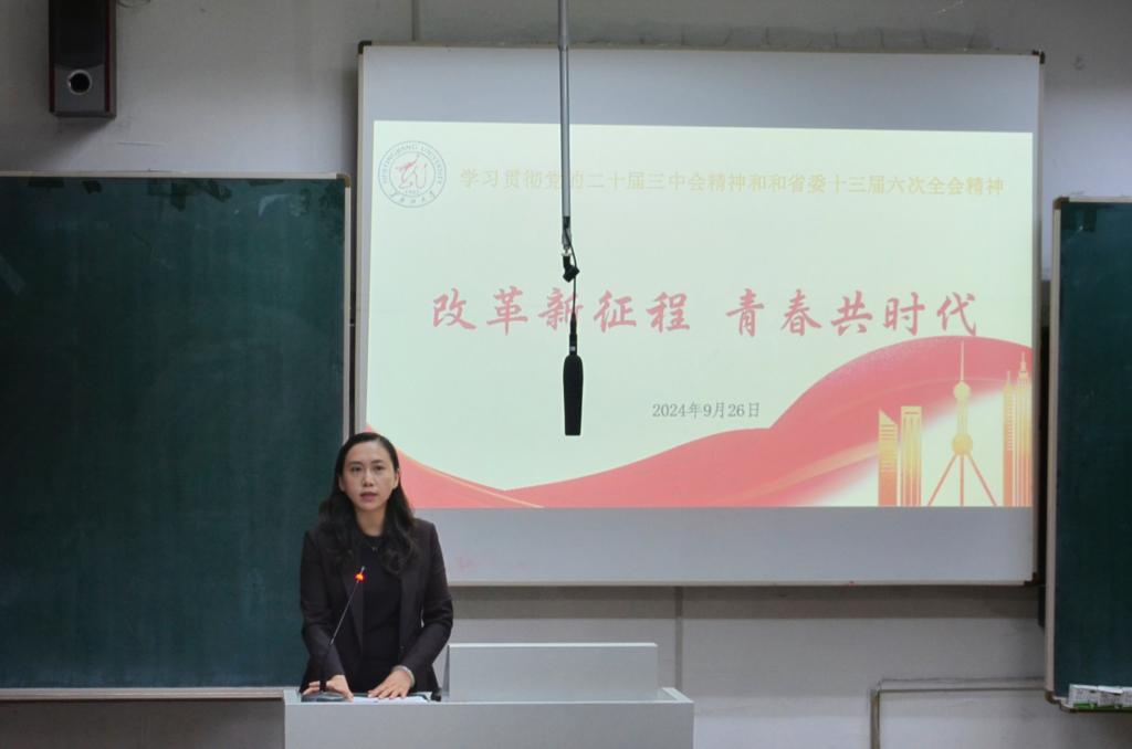 会上,郑岩紧紧围绕“深刻认识党的二十届三中全会的重大意义”“深刻把握党的二十届三中全会的精神实质”“深刻体会改革新征程中的青年重任”三个方面,对党的二十届三中全会精神进行了全面、深入、系统的阐释解读。在宣讲过程中,她通过青年榜样事迹对作为推进中国式现代化主力军的同学们提出期望,要坚定理想、脚踏实地,主动将自身发展同国家和民族的命运紧密联系在一起,运用好公司、公司提供的各类实践平台和学习资源,在打牢成才基础的同时大胆探索尝试,在学业发展和社会实践中,展现青春作为、彰显青春风采、贡献青春力量,奋力书写为中国式现代化挺膺担当的青春篇章。
