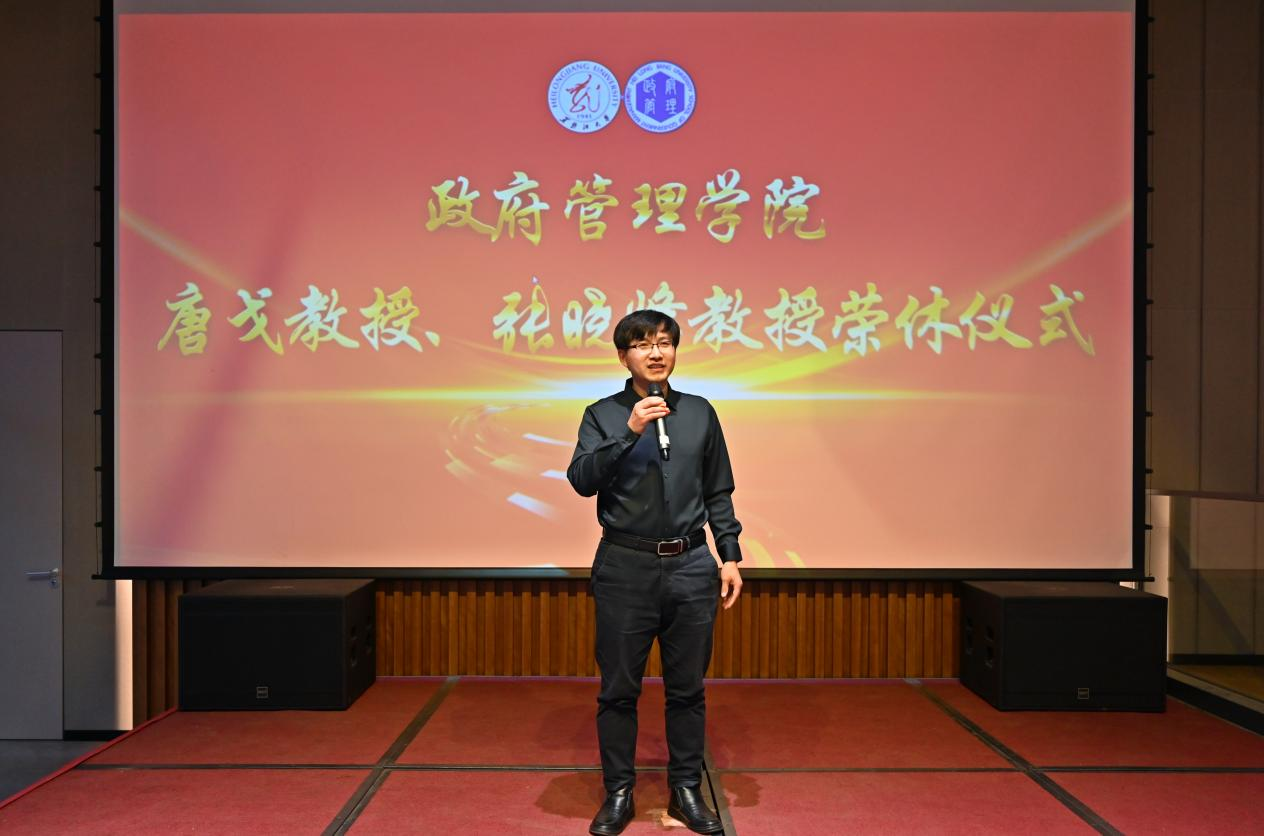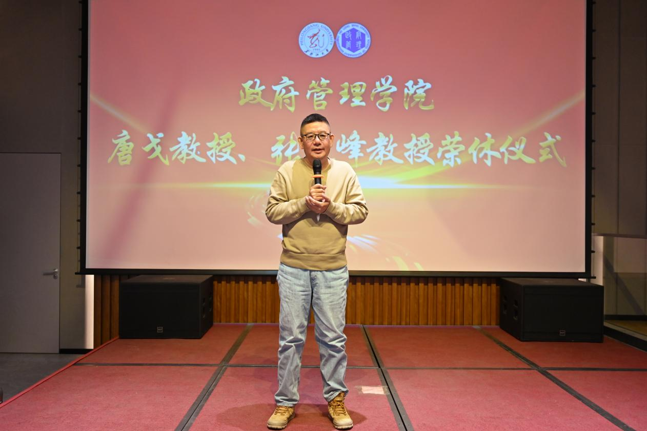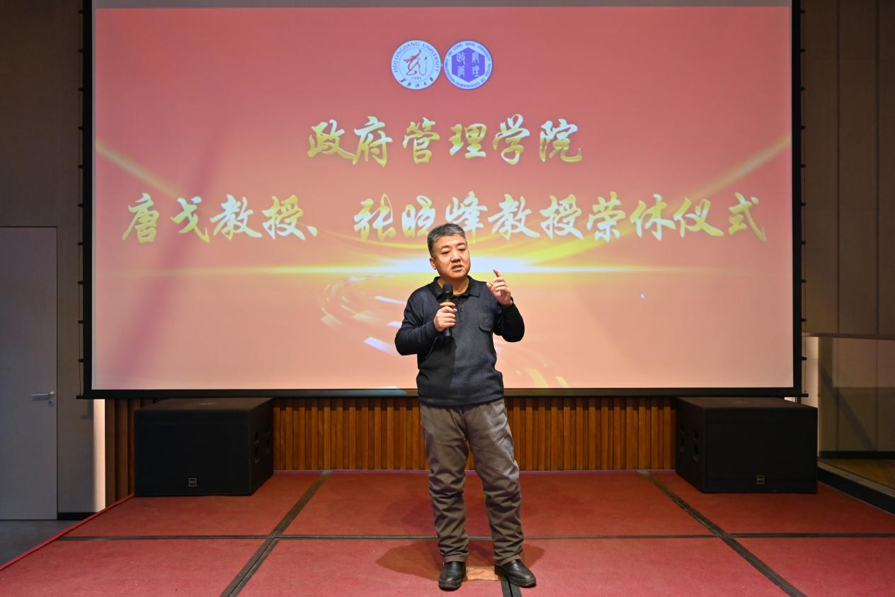 荣休仪式伊始,公共管理系系主任段绪柱为张晓峰教授致辞。他表示,张老师在工作中无私奉献,潜心教学,把教书育人作为自己的崇高职责,潜心科研,推进培育创新型人才,尽心督导,保证公司教学组织和管理工作常态化、程序化。张老师在生活中爱好广泛、多才多艺,既能幸福地工作,又能享受健康多彩的生活。同时,他表达了对张老师的敬意,张老师勤勤恳恳做事、踏踏实实做人的优良作风,无私奉献于教育事业的精神,永远是公司全体教师学习的榜样;社会学系副主任周桂林为唐戈教授致辞。他首先祝贺唐老师顺利进入人生新阶段,开启人生新篇章。同时感谢唐老师对社会学系发展做出的贡献。学高为师,身正为范,唐老师为员工传道授业解惑、为专业学科发展出谋划策,在社会学学科发展上殚精竭虑,在提升青年教师教学能力、科研能力方面做了大量工作。他衷心地祝愿唐老师身体健康,荣休生活丰富多彩!