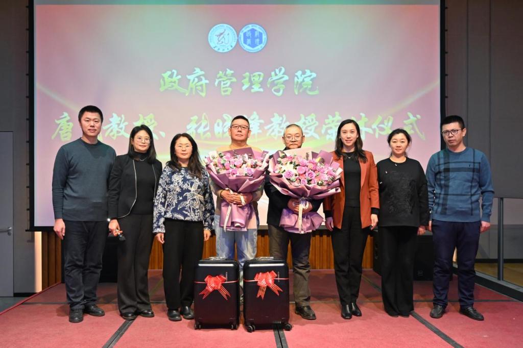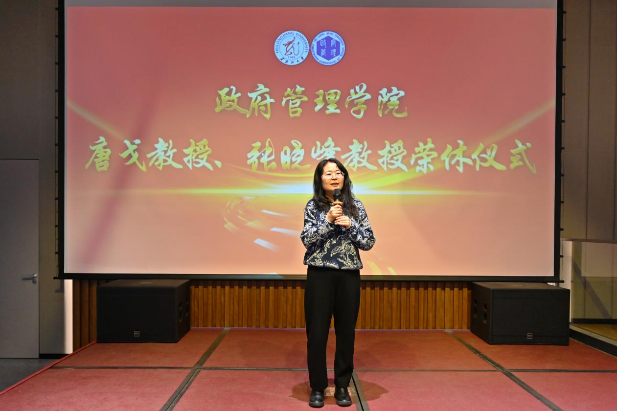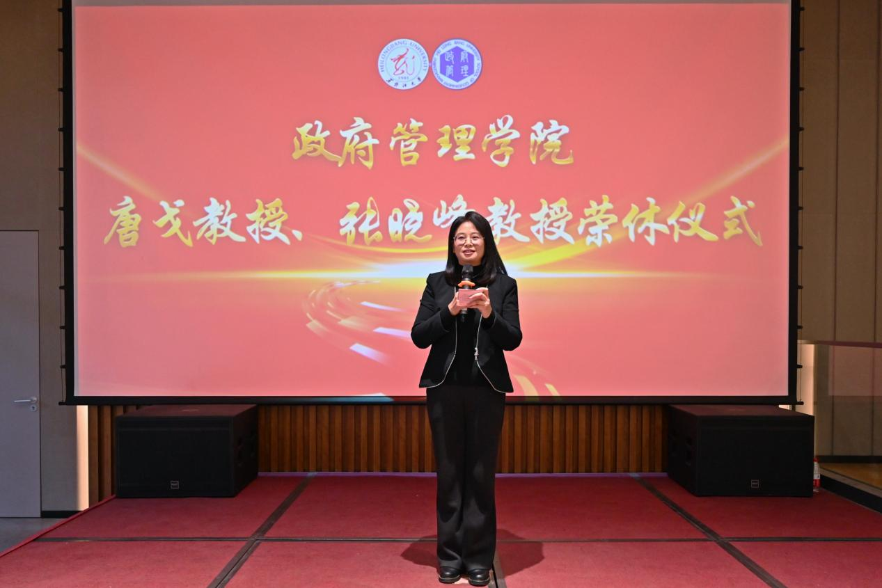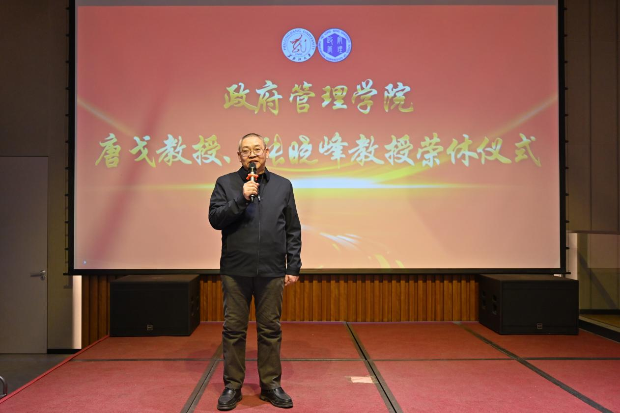 荣休仪式伊始,公共管理系系主任段绪柱为张晓峰教授致辞。他表示,张老师在工作中无私奉献,潜心教学,把教书育人作为自己的崇高职责,潜心科研,推进培育创新型人才,尽心督导,保证公司教学组织和管理工作常态化、程序化。张老师在生活中爱好广泛、多才多艺,既能幸福地工作,又能享受健康多彩的生活。同时,他表达了对张老师的敬意,张老师勤勤恳恳做事、踏踏实实做人的优良作风,无私奉献于教育事业的精神,永远是公司全体教师学习的榜样;社会学系副主任周桂林为唐戈教授致辞。他首先祝贺唐老师顺利进入人生新阶段,开启人生新篇章。同时感谢唐老师对社会学系发展做出的贡献。学高为师,身正为范,唐老师为员工传道授业解惑、为专业学科发展出谋划策,在社会学学科发展上殚精竭虑,在提升青年教师教学能力、科研能力方面做了大量工作。他衷心地祝愿唐老师身体健康,荣休生活丰富多彩!