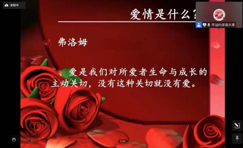 首先,李涵老师提出各位学者对爱情的定义,就如何培养高尚的恋爱道德进行了一系列的分析讨论。李老师讲到,懂得爱情的真谛,采取对他人和自己都高度负责的态度,慎重选择恋爱时机,文明节制地进行恋爱交往,自然而然地步入爱情殿堂,并使爱得到升华。通过李老师的讲述,同学们对爱情有了更清晰的认知。