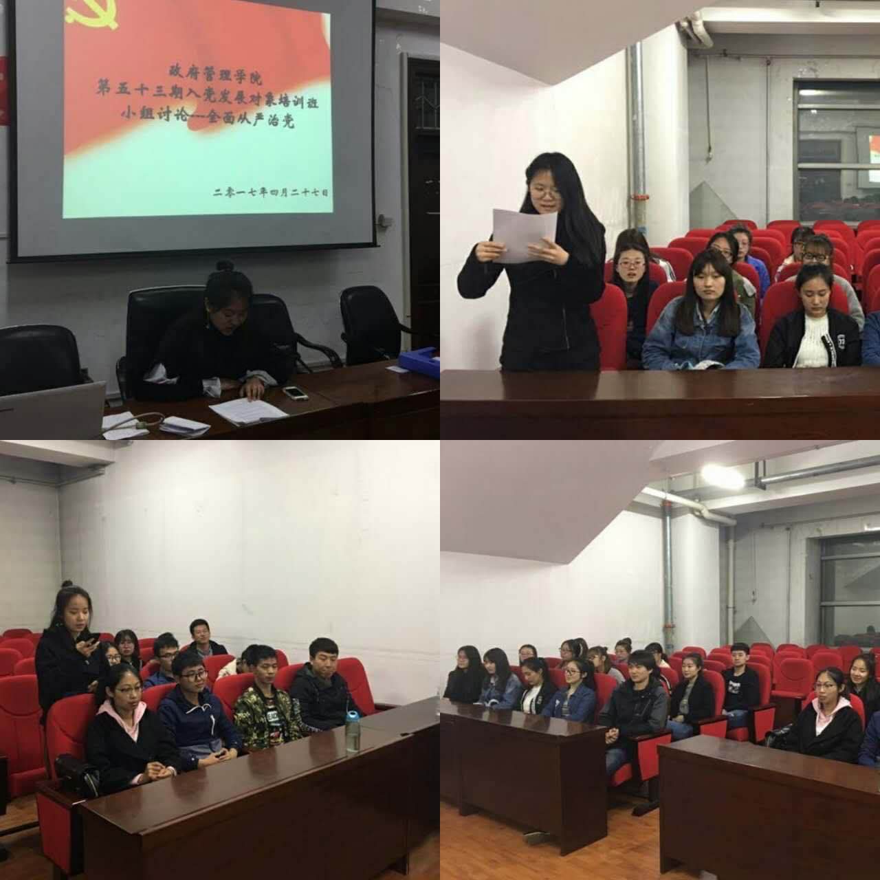 为深入学习习近平总书记系列讲话精神,提升新发展党员的政治素养。2017年4月27日晚8时20分,xcsports第五十三期入党发展对象培训班全体学员在汇文楼942室以“全面从严治党”为主题进开展小组讨论。xcsports第五十三期入党发展对象培训班组长尹柏麟同学主持,全体学员参与了此次讨论。