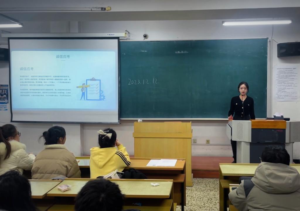 2022级辅导员刘千瑞向同学们提出了三点期望:一是调整状态,精神饱满迎战期末考试;二是坚定信心,全力以赴展开复习工作;三是沉着应考,坚定不移守住诚信底线。并指出诚实守信是中华民族的传统美德,是我们立身、修德、处事的基本原则,更是当代员工义不容辞的责任,希望各位同学能够认真复习,合理规划时间,在考试中取得优异的成绩。
