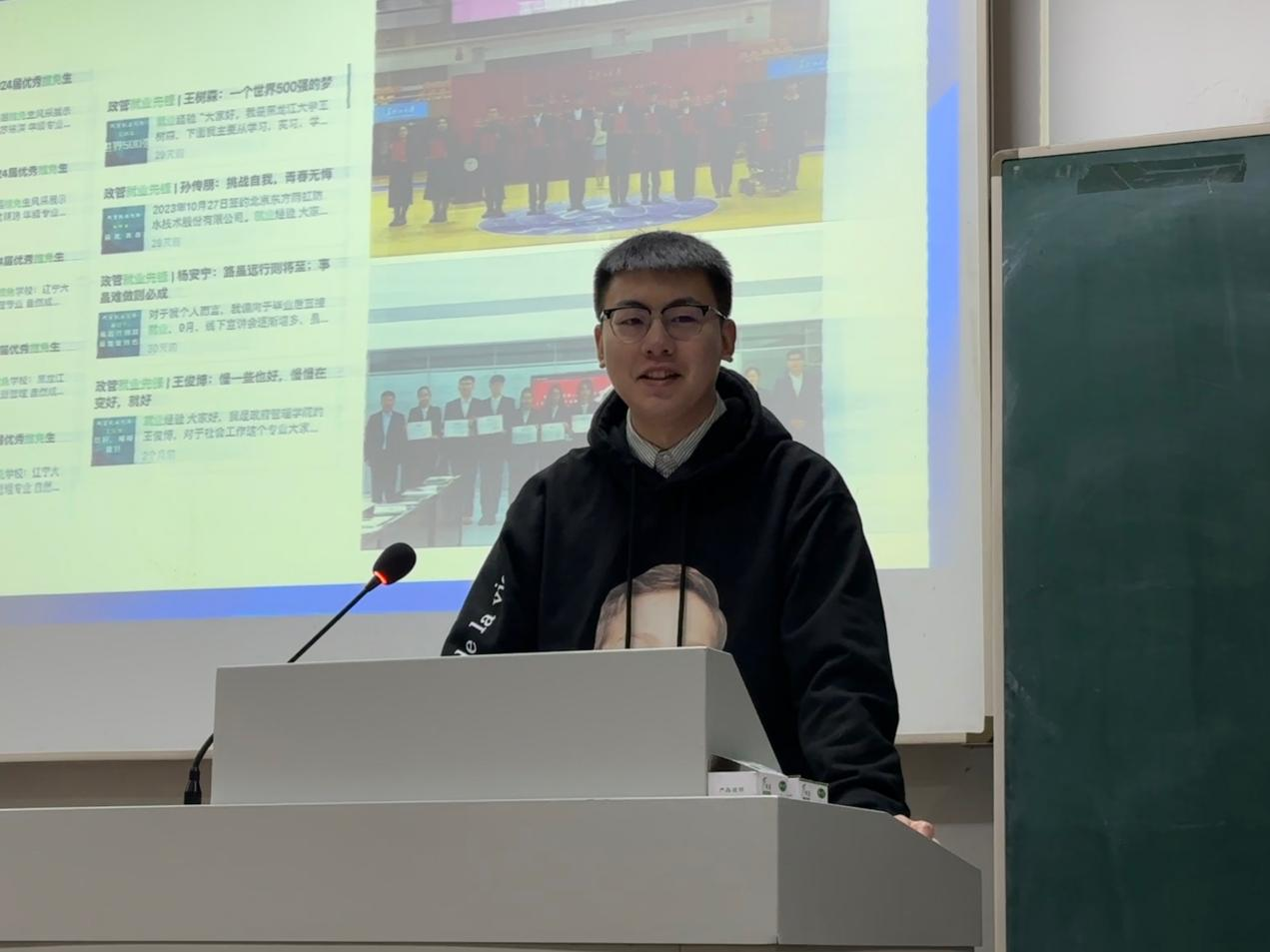 2020级社会工作专业王俊博为同学们进行就业经验分享。首先,王俊博同学和大家分析了自己的简历,帮助大家从学习、员工工作、实习实践、社交四个方面明确了大学四年的努力方向。随后,他结合过往求职经验以及人力资源的实习经验,从企业的角度出发,帮助大家理解企业都需要什么类型的人才。最后,王俊博和同学们分享:每个人的优秀是不一样的,我们不必羡慕别人的成功。只要目标明确,积极努力,就一定会度过心满意足的大学四年。
