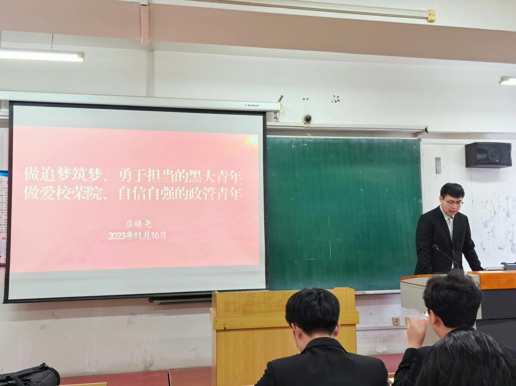 庄皓尧同学从四个方面展开交流,进行了以“做追梦筑梦、勇于担当的黑大青年,做爱校荣院、自信自强的政管青年”为主题的分享,告诉学员们要做一名政治立场坚定,理论功底扎实的黑大青年,坚持读原著、学原文、悟原理,在阅读学习中多下功夫;要做一名家国情怀浓厚,脚踏实地奋斗的黑大青年,庄皓尧结合自身社会实践经历总结经验,强调要将小我融入全局,在新时代的广阔天地中,在中国式现代化龙江实践中有所作为;要做一名根植广大同学,热忱奉献集体的黑大青年,奋斗是青春最亮丽的底色,要以青春的动力担当奉献,真正把个人潜力与优势禀赋转化为实际成效与前进动力;要做一名人格健全,多元全面发展的黑大青年,要珍惜公司为我们提供的广阔舞台,充分尝试,勇敢探索,找到热爱。最后,他希望学员们眼里有光,脚下有路,加强理论学习,脚踏实地奋斗。