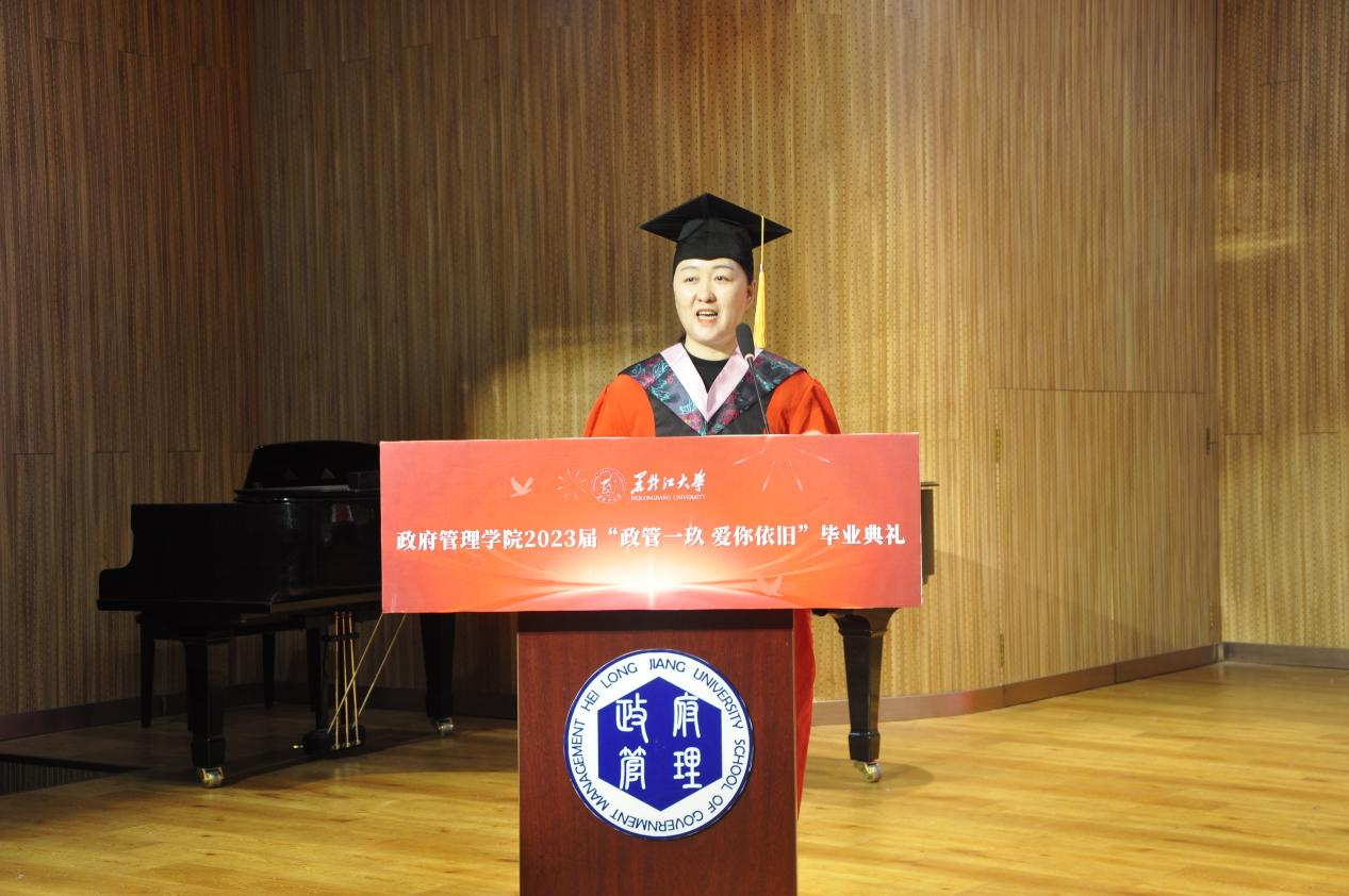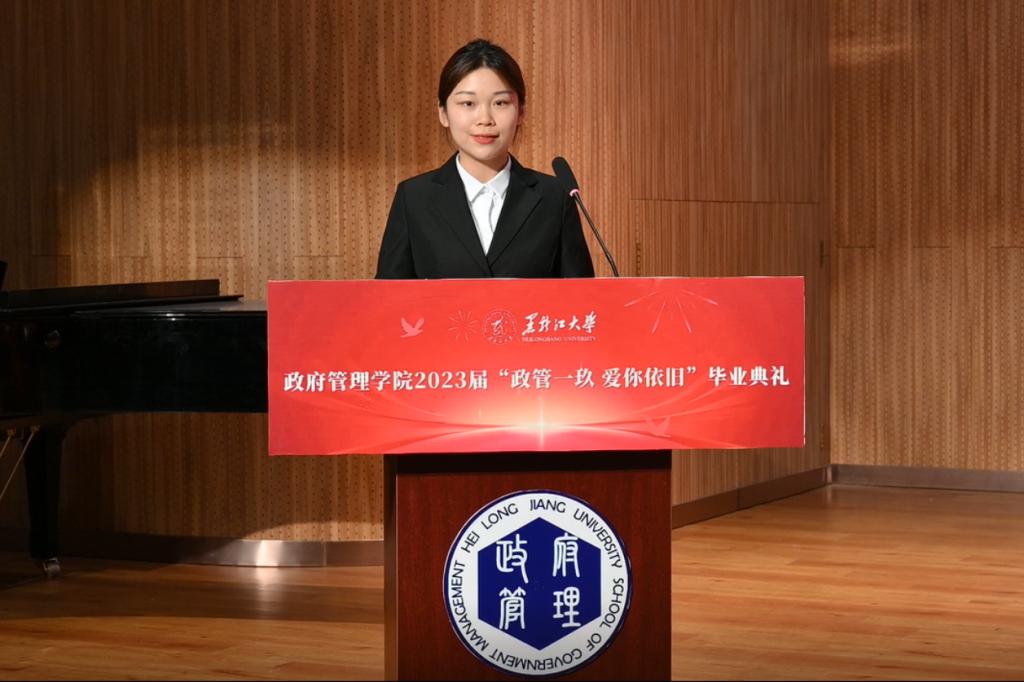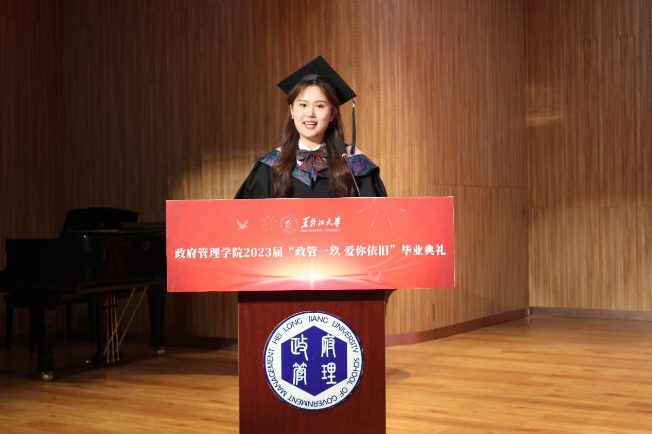 2019级社会工作专业杜美琳同学作为毕业生代表发言,她与同学们共同回忆了四年的青春时光,表达了对老师和母校的美好祝愿。2021级行政管理专业田丽新同学作为在校生代表发言,她代表全体在校生对学长学姐们即将踏上新的人生旅途表示祝愿,并表示未来会以他们为榜样,以优异的成绩为母校贡献青春力量。