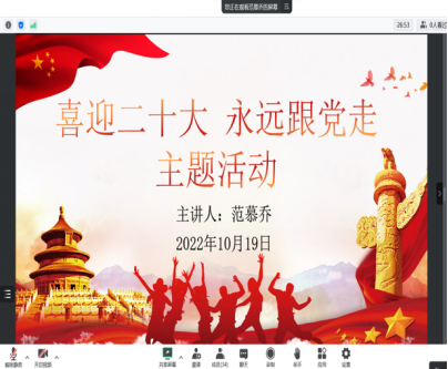 接下来,范老师就如何弘扬五四精神、争做有为青年进行了讲解学习,青年应该为了民族的独立和解放、为了国家的繁荣和富强而前赴后继,英勇奋斗。在疫情背景下出现过的许多优秀青年,就是大家最好的榜样。最后,全体成员一同学习和了解了在10月16日上午召开的中国共产党第二十次全国代表大会上习近平总书记向大会作出的报告内容,主要包括三个“务必”,十年来的三件大事,牢牢把握的五个重大原则以及五个“必由之路”等具有重要指导意义的思想。学习结束后范老师向同学们提出殷切希望,党的二十大是在非常重要的历史节点召开的一次重大会议,我们不管是作为团推优的一员,还是作为一个中华人民共和国的公民,都应该关注并了解党和国家重大会议的思想和指,不断提高自己的思想意识素养。