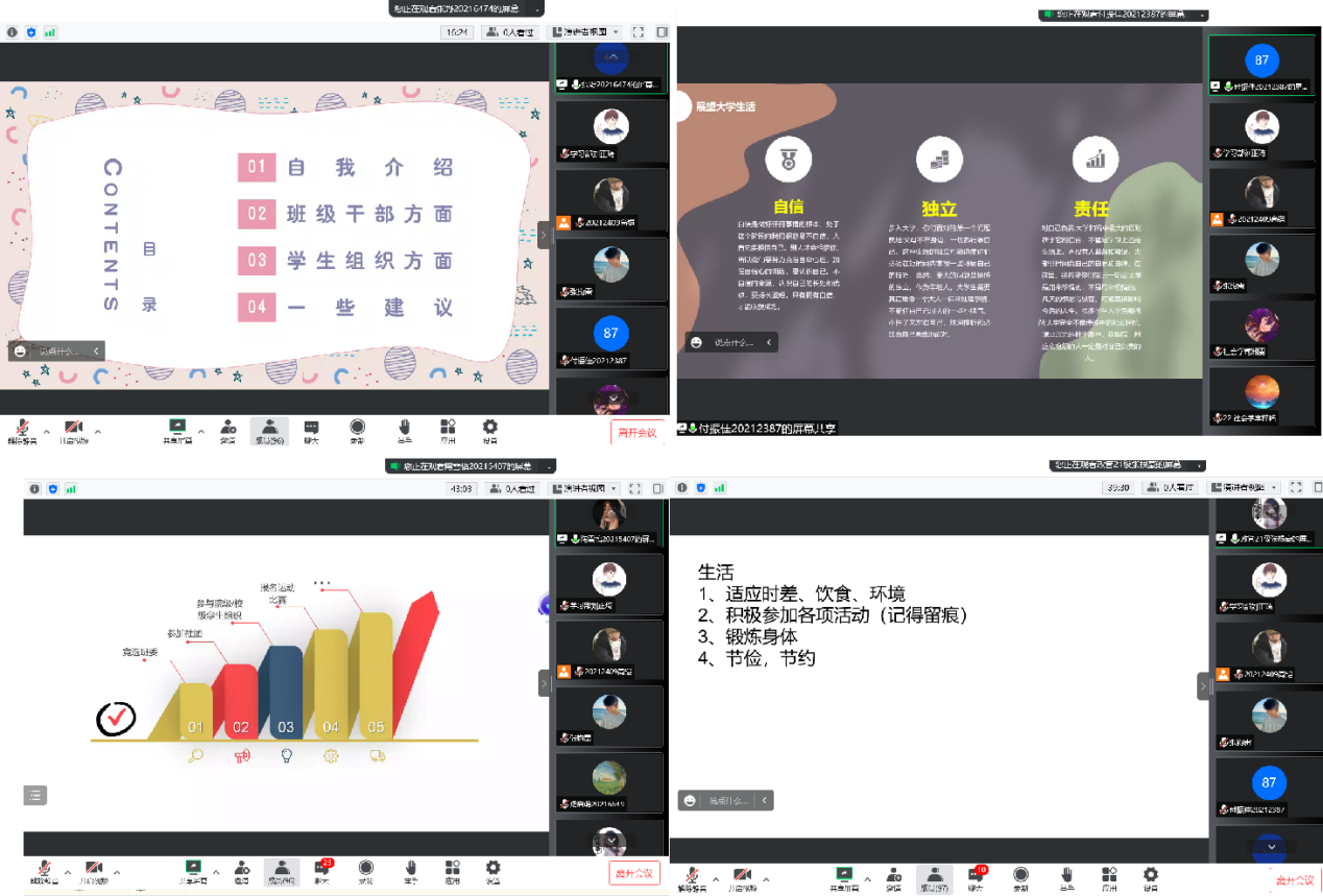 会议最后,2021级员工代表就步入大学初期的常见问题、大学学习生活和高中学习生活的异同等问题进行了详细的解答,对如何适应老员工活给出了合理的建议,鼓励同学们自主学习、克服“回归心理”、克服“目标间歇”、建立和谐人际关系、学会自我管理,并给出了自我调节的一些方法。