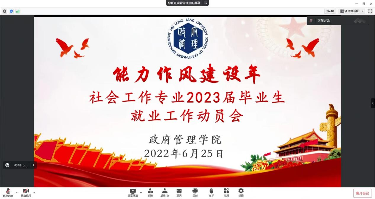 为进一步推进就业工作,帮助毕业生找准就业目标,调整就业心态,树立正确的择业就业观念,提高就业竞争力。xcsports于2022年6月25日下午4:00在腾讯会议线上开展社会工作专业2023届毕业生就业工作动员会,本次会议由社会学系主任孙志丽老师主讲,2023届同学参加此次会议。