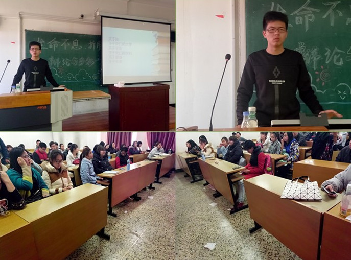 活动伊始,主持人先向大家简单介绍了知行协会:知行协会社团为学术科技类社团,依托于xcsports,以“探求学术智慧,提高自身涵养,践行学术理念,促进自身发展”为宗旨,着重研究发展学术。接下来,周湛淼同学从以下三个方面展开讲述:关于自己、关于大学、关于未来。首先,他向同学们分享了自己的亲身经历:在刚刚入学的时候,面对众多的员工组织、社团,他也曾感到迷茫,最终经过认真考虑,选择加入了校广播台和创业协会。在校广播台期间,经过自身努力,进入了几乎由新闻传播公司的同学包揽了的播音部,又经历了几轮淘汰,定编,最终留在了播音部。以此来启发同学们对于理想不必刻意追求,只要目标明确,并且为之付出努力,不辜负初心,改变就会在不经意间出现。随后,他又向大家讲述了一个极端的案例:身边的一个同学由于对高考成绩不满意,以至于上大学以来一直自怨自艾,意志消沉,无法开始新的生活,通过这个真实的案例他意在告诫大家:要学会面对现实,面对困难不要止步不前,不要轻易放弃自己,踏下心来,学会思考,永远不要丧失生活的希望。最后,周湛淼同学指出了读书的重要性,书籍是无声的导师,教会我们知识,是人生的一笔财富,并且向大家推荐了《无政府、国家和乌托邦》、《管理决策的新科学》等优秀书籍。
