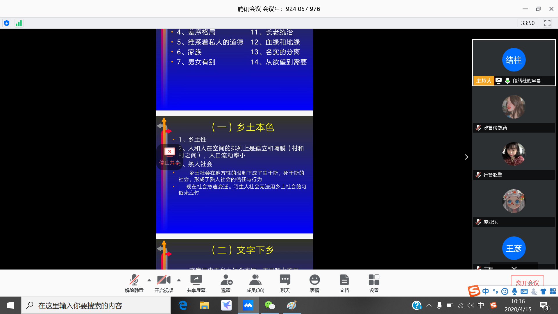 段老师介绍到,《乡土中国》是费孝通著述的一部研究中国农村的作品,全书由14篇文章组成,涉及乡土社会人文环境、传统社会结构、权力分配、道德体系、法礼及血缘地缘等多个方面。段老师根据章节构成,与同学们探讨了礼治秩序、无讼、无为政治、长老统治等方面的知识,从不同的角度为大家揭开了传统乡土中国的神秘面纱。在讲解过程中,同学们通过互动面板积极向老师提问,认真回答老师的问题,形成了师生间的良好互动。活动接近尾声,段老师强调,读书让人厚实,使人精神丰富,呼吁大家一定要养成读书的好习惯。在同学们的积极响应中,本次知行读书活动圆满结束。